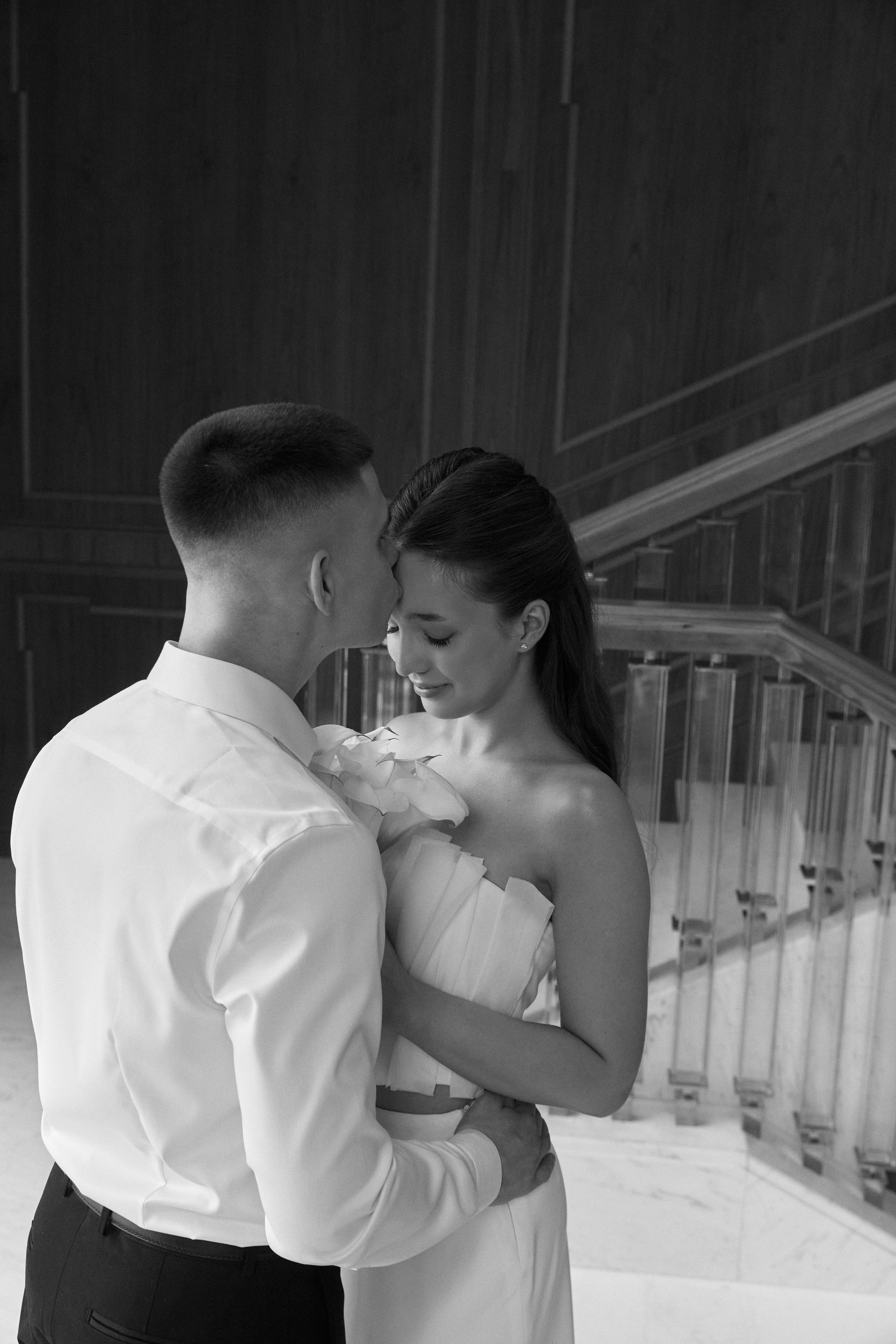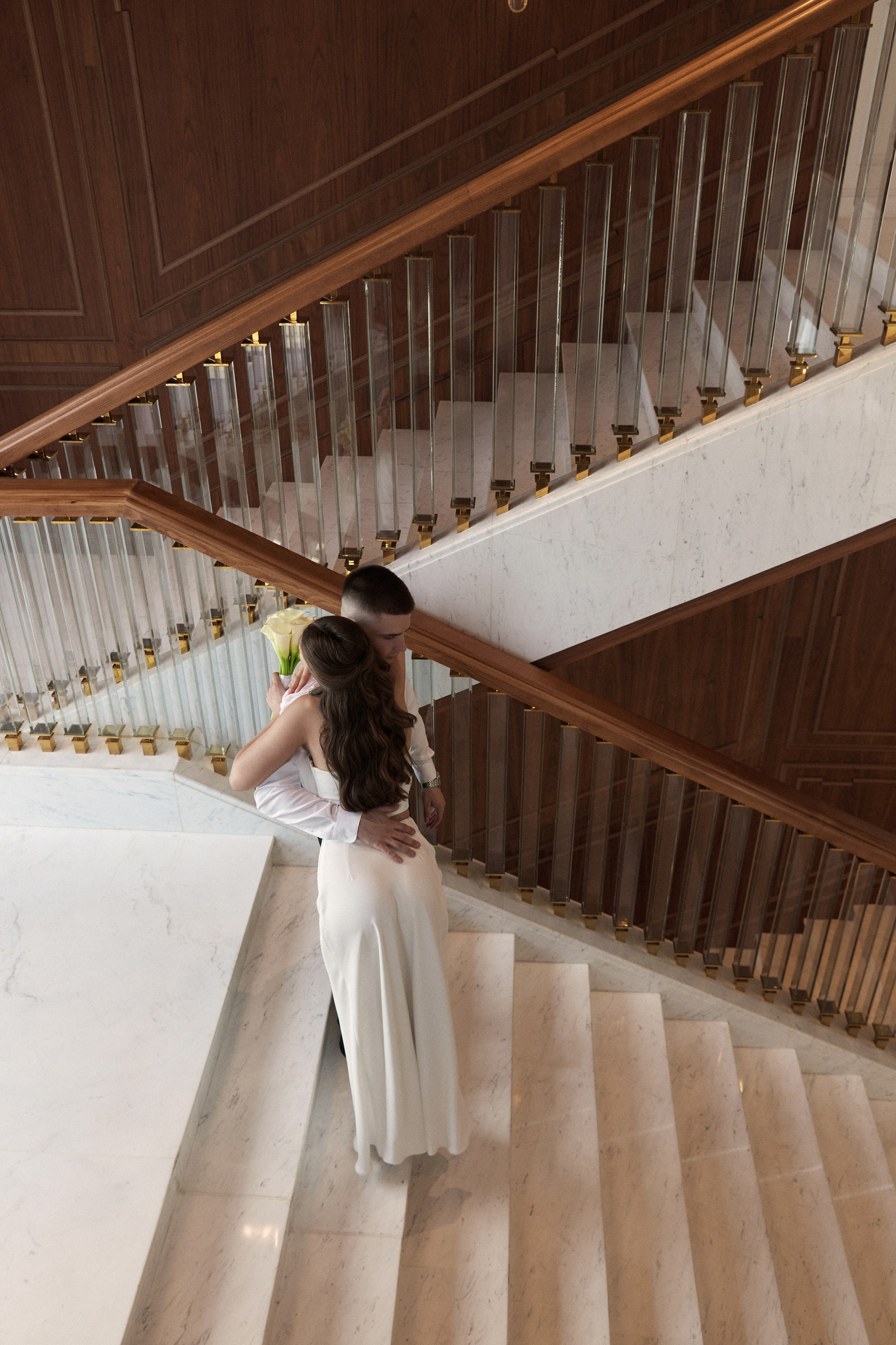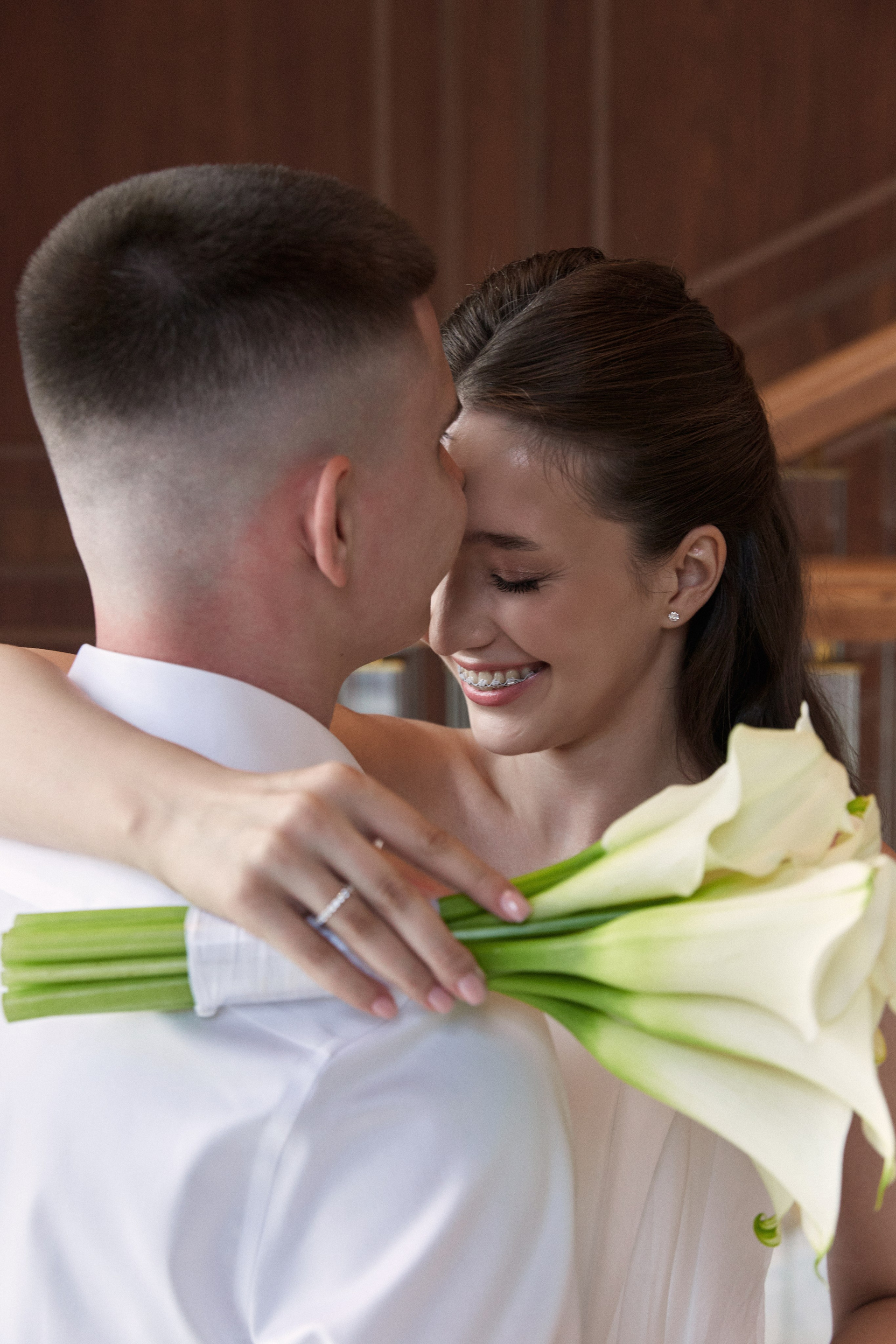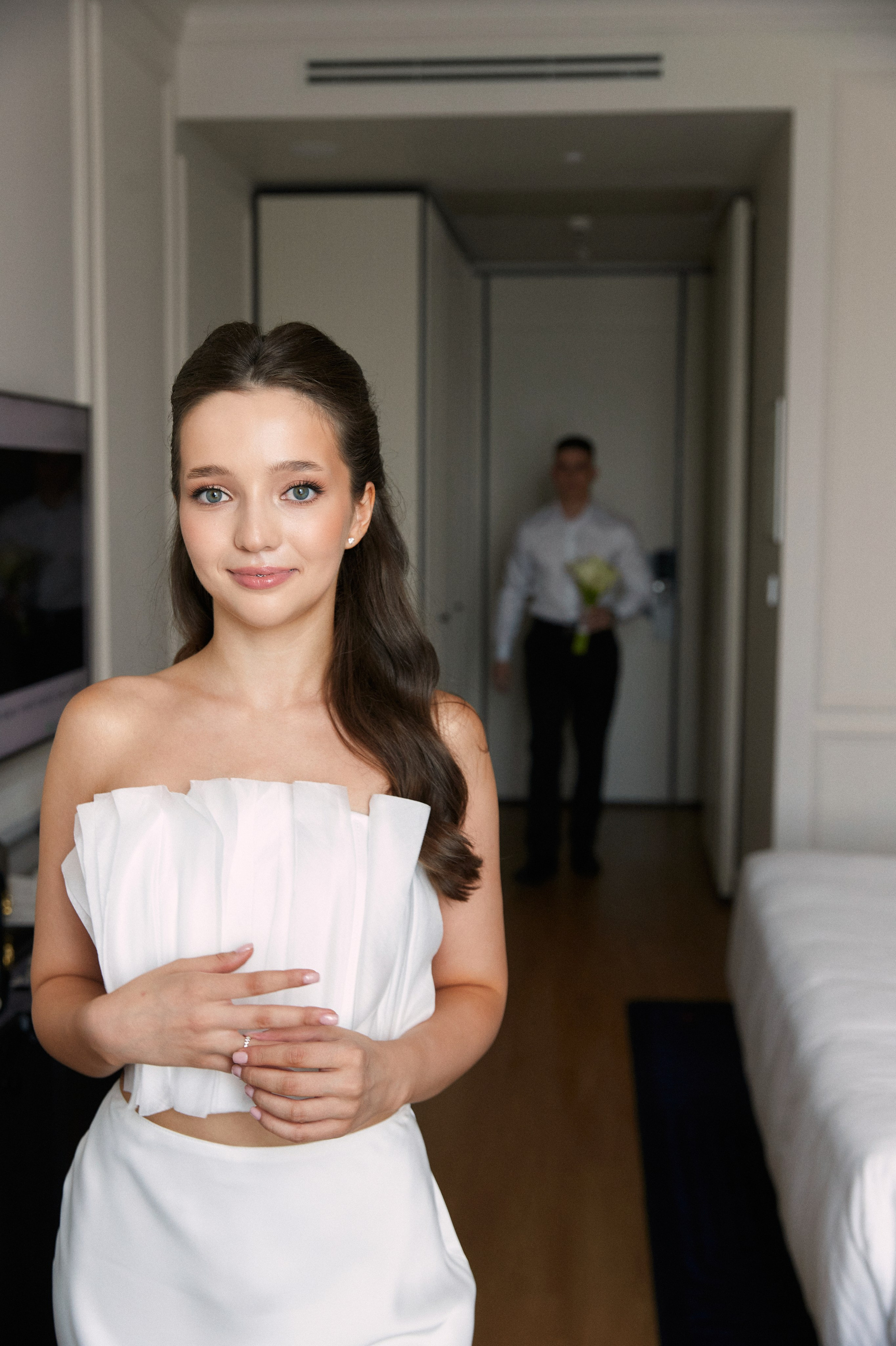 Аля с Пашей выбрали камерный формат. Утро началось в отеле: сборы невесты, трогательная первая встреча и совместная фотосессия. Для регистрации ребята выбрали Грибоедовский ЗАГС. Там они с близкими разделили свою продолжительную историю любви, которую мы запечатлели, смотри как это было